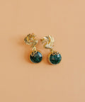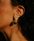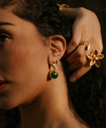 The Derya earrings pair a faceted Emerald stud with a small sculpted gold bird charm that drops from its base. Raw and refined in equal measure — the kind of earring you have to see up close to fully appreciate.