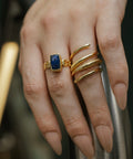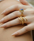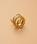The Demir ring is a 4 coiled gold loop around statement piece with the middle bands varying in thickness and a leaf engraved design.