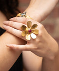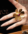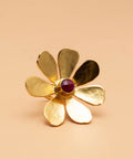 The Gulya ring is a gold flower petal ring with pink ruby stone.