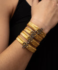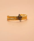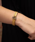 The Dilek cuff is a gold mesh adjustable cuff with with oxidized silver black linked cobra motif.